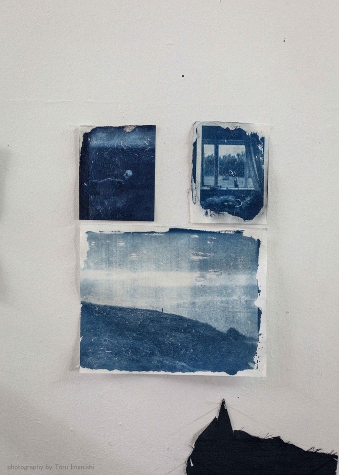 今西氏は、青の濃淡で像を作り出す「サイアノプリント」という技法を用いて、現地の景色やものを写し込んだ作品を制作されました。シンプルな単色の濃淡のみで表現されるそれは、かえって様々な想像を掻き立ててくれます。