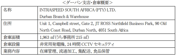 阪急阪神エクスプレス(本社:大阪市北区 代表取締役社長:谷村 和宏)の南アフリカ法人である INTRASPEED SOUTH AFRICA (PTY) LTD.(本社:ヨハネスブルグ、以下、INTRASPEED 社)は、5月14日に南アフリカ東南部のダーバン支店・倉庫を移転し、6 月より本格的に営業を開始しました。