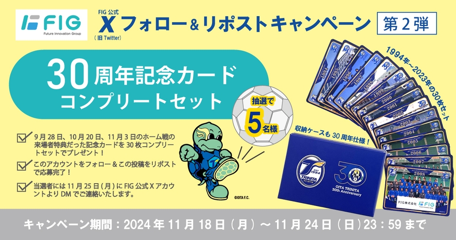 FIG株式会社は、アドボードスポンサーの契約を結んでいる大分トリニータの30周年を記念して、FIG公式X(@FIG4392 https://x.com/FIG4392 )をフォロー&リポストすることで、大分トリニータ30周年記念カードのコンプリートセットが当たるキャンペーンを本日2024年11月18日(月)から11月24日(日)まで実施します。