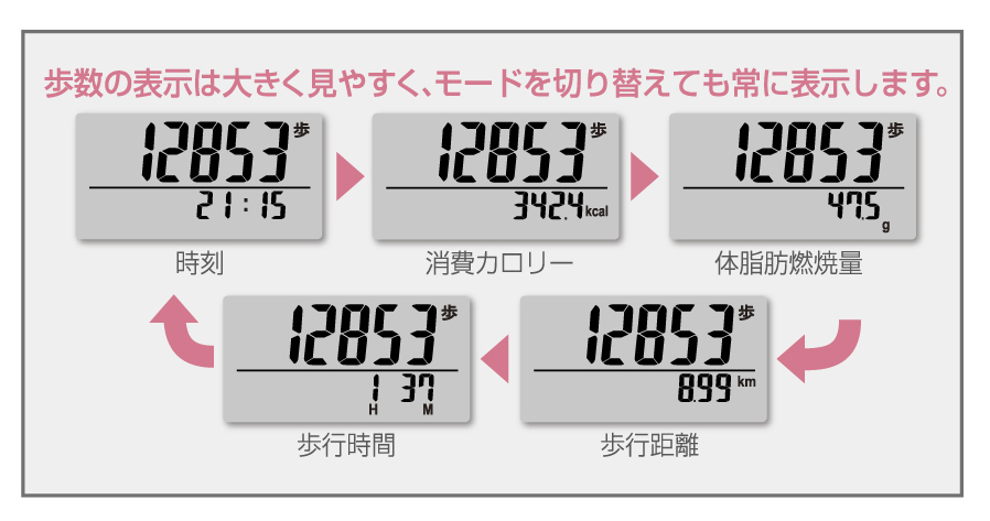 モードを切り替えても常に上段に大きな文字で歩数を表示しますのでシニアの方にもやさしい設計です。