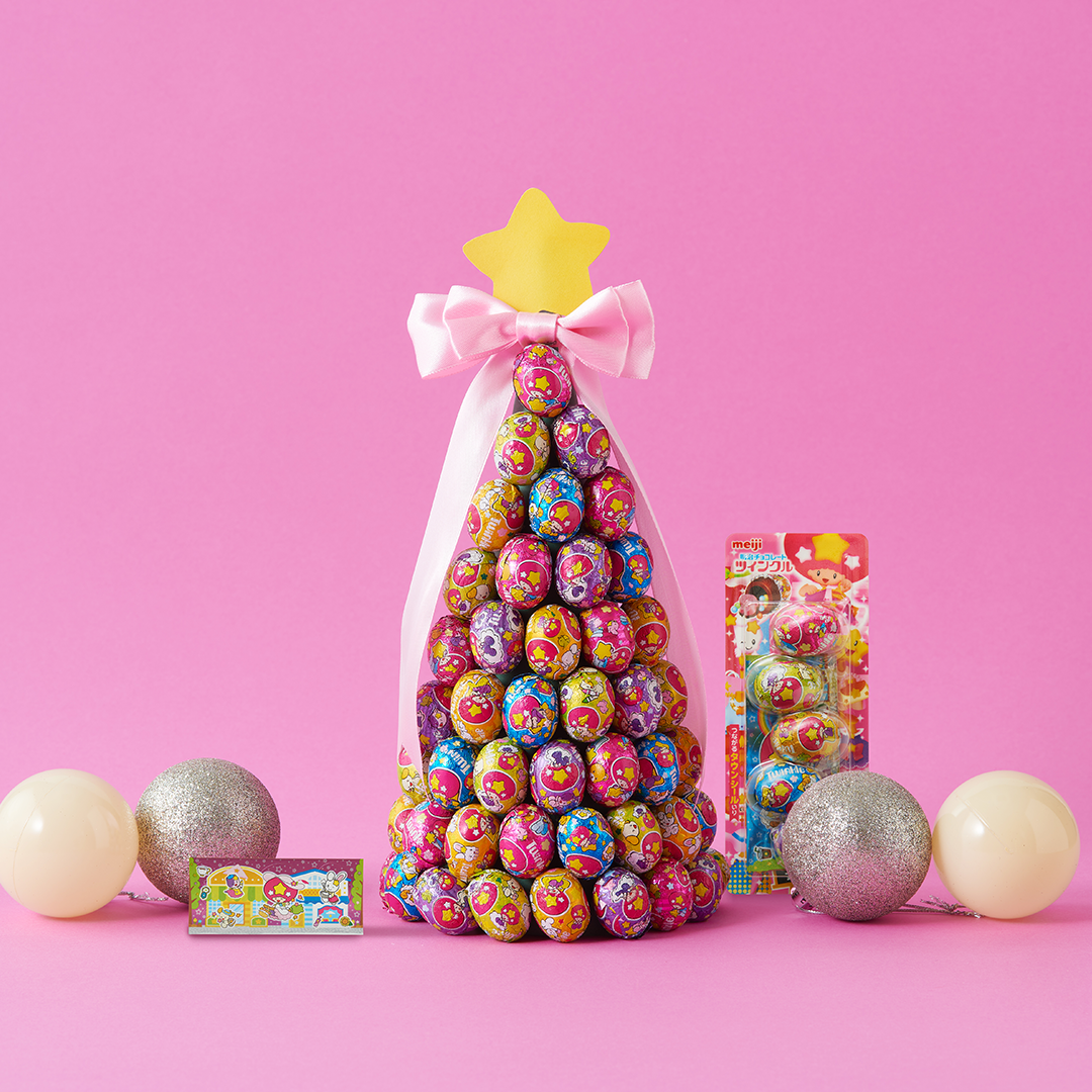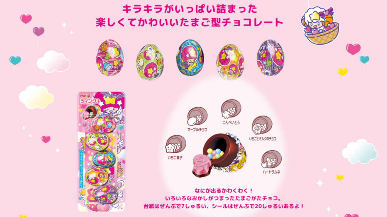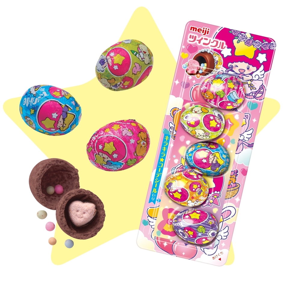 キラキラパッケージのたまご型チョコ「ツインクル」45周年記念! リトルツインスターズ×ツインクル 初の“お星さまコラボ”。 ホログラムシールやシール帳で人気の“平成女児”を楽しめる! 「ツインクル」が約10年ぶりにリニューアル。 台紙もシールももっと“キラキラかわいい”を詰め込んだデザインに!