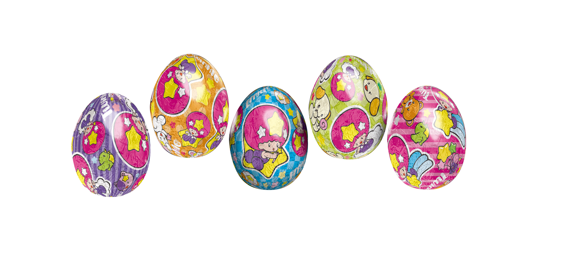 たまご型のチョコレート「ツインクル」は、1つ1つがカラフルなアルミ紙で包まれています。実はそのアルミ紙の色にも、今回名前がつきました。(ほしがきらめく深夜のパープル/夕暮れのオレンジ/ゆめみごこちのブルー/ながれ星のイエローグリーン/天の川のピンク)
