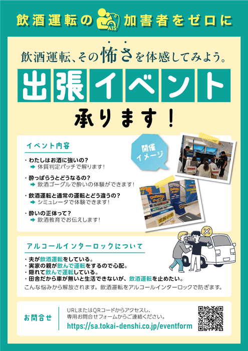 飲酒運転の加害者をゼロにする活動を行う東海電子、飲酒教育・飲酒運転体験など出張イベント承ります!