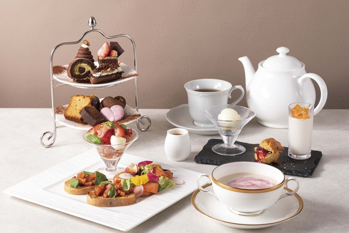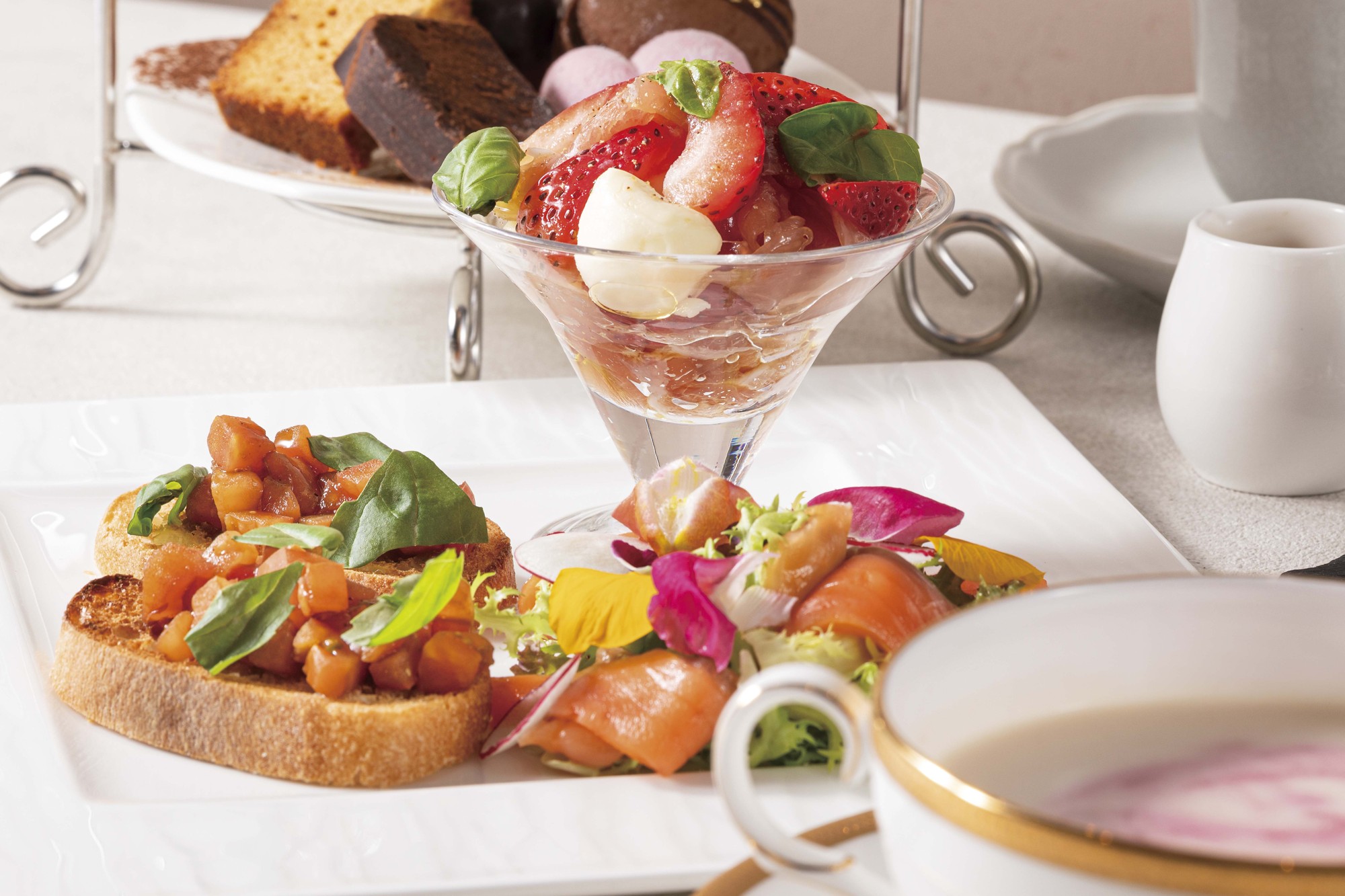 セイボリーでは、旬のいちごを使用し酸味と塩味のハーモニーが絶妙な「いちごと生ハムのカプレーゼ」や、「フレッシュトマトのブルスケッタ」などをご用意。