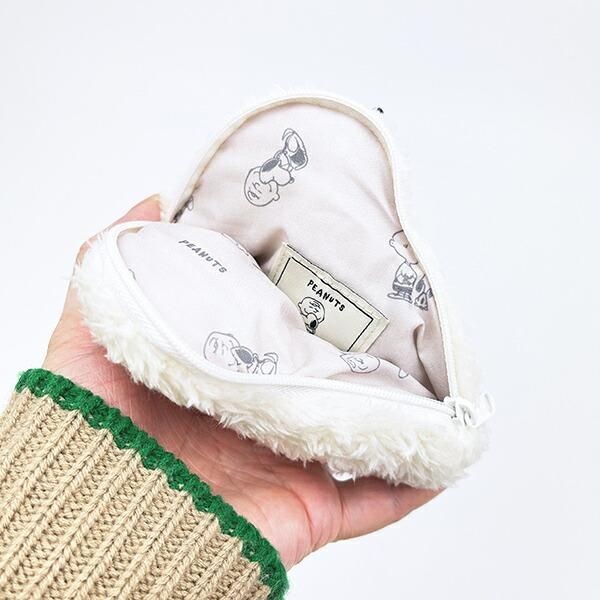 いままではちょっとかっここよく、おしゃれな印象のメタリックでしたが、スヌーピーはジャンル違いのこんなラインナップもございます。こちらはスヌーピー フェイスポーチ monokure mate です。さきほどのメタリックとは対照的にもこもこ感が病みつきになりそうな超癒し系ポーチです。まるでぬいぐるみな生地がくせになりそうなかわいさです。