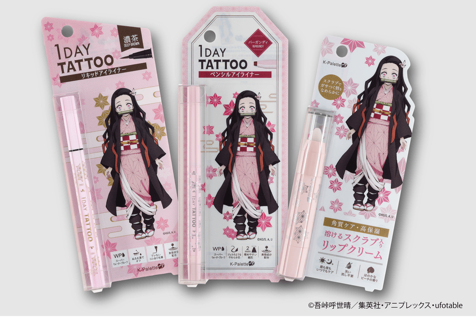 クオレ株式会社(本社:大阪府吹田市、代表取締役社長:木下 英司)は、「1DAY TATTOO」でおなじみの耐久多機能性プチプラコスメブランド「K-パレット」よりテレビアニメ「鬼滅の刃」との特別商品を発売します。キャラクター4人とそれぞれのイメージに合わせたリキッドアイライナー、ペンシルアイライナー、リップシュガースクラブを2021年12月14日に全国のバラエティショップ・ドラッグストアにて販売します。また、全ての商品パッケージは切り取って“しおり”として再利用可能な仕様です。