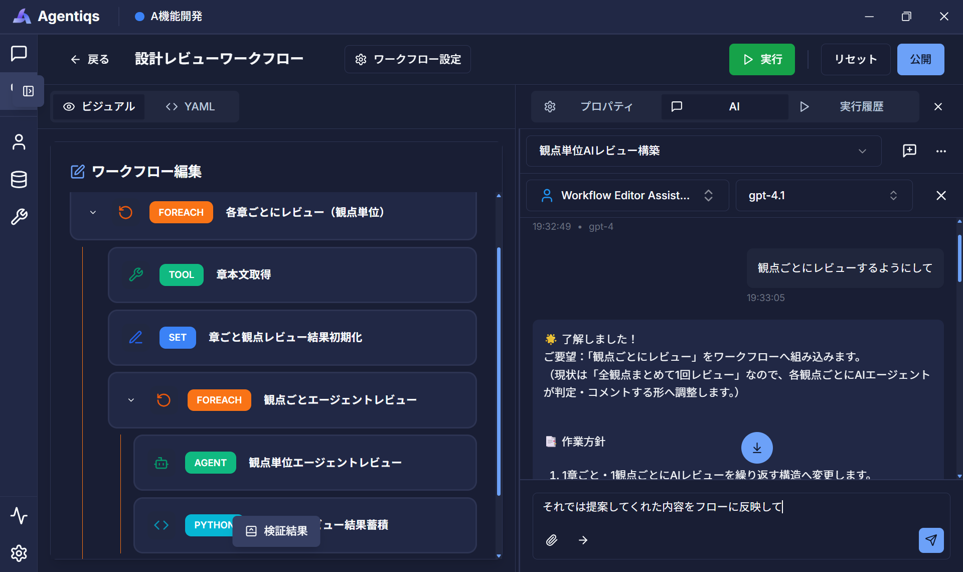 開発タスクを適切な単位に分割し、AIエージェントとルールベースの処理を組み合わせて実行するワークフロー機能を備えています。工程や作業内容に応じてAIの役割を明確にすることで、抜け漏れや結果のばらつきを抑え、利用者や実行タイミングが異なっても一定水準の結果を得られるよう支援します。