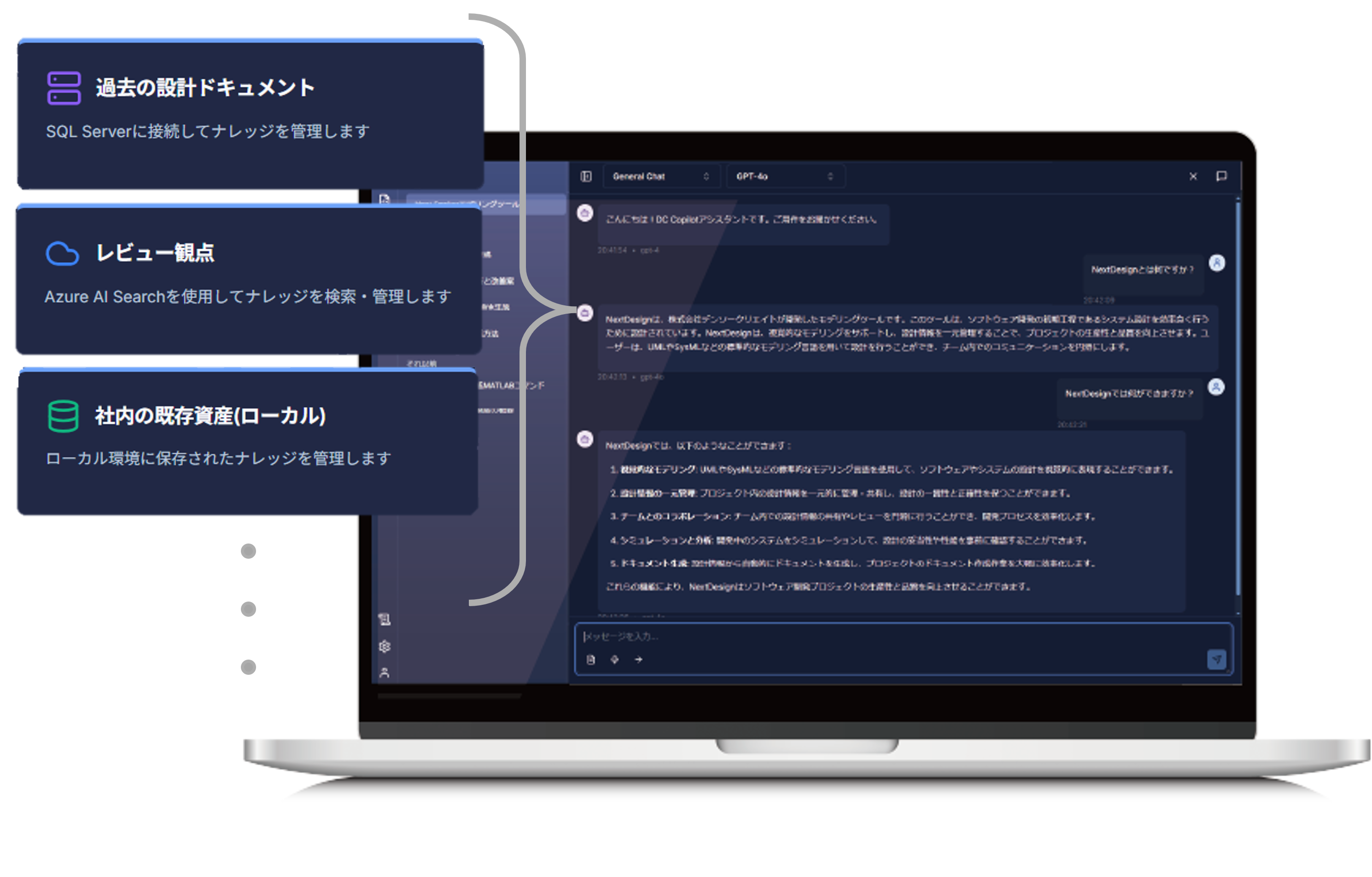 また、会話の目的や履歴を保持し、履歴RAGや意味検索を通じて文脈を継続的に活用することで、設計に関する長期的な対話においても、過去の検討内容を維持したままAIを活用できます。