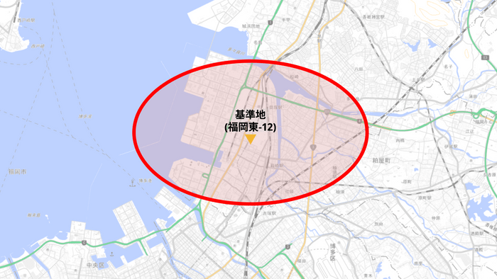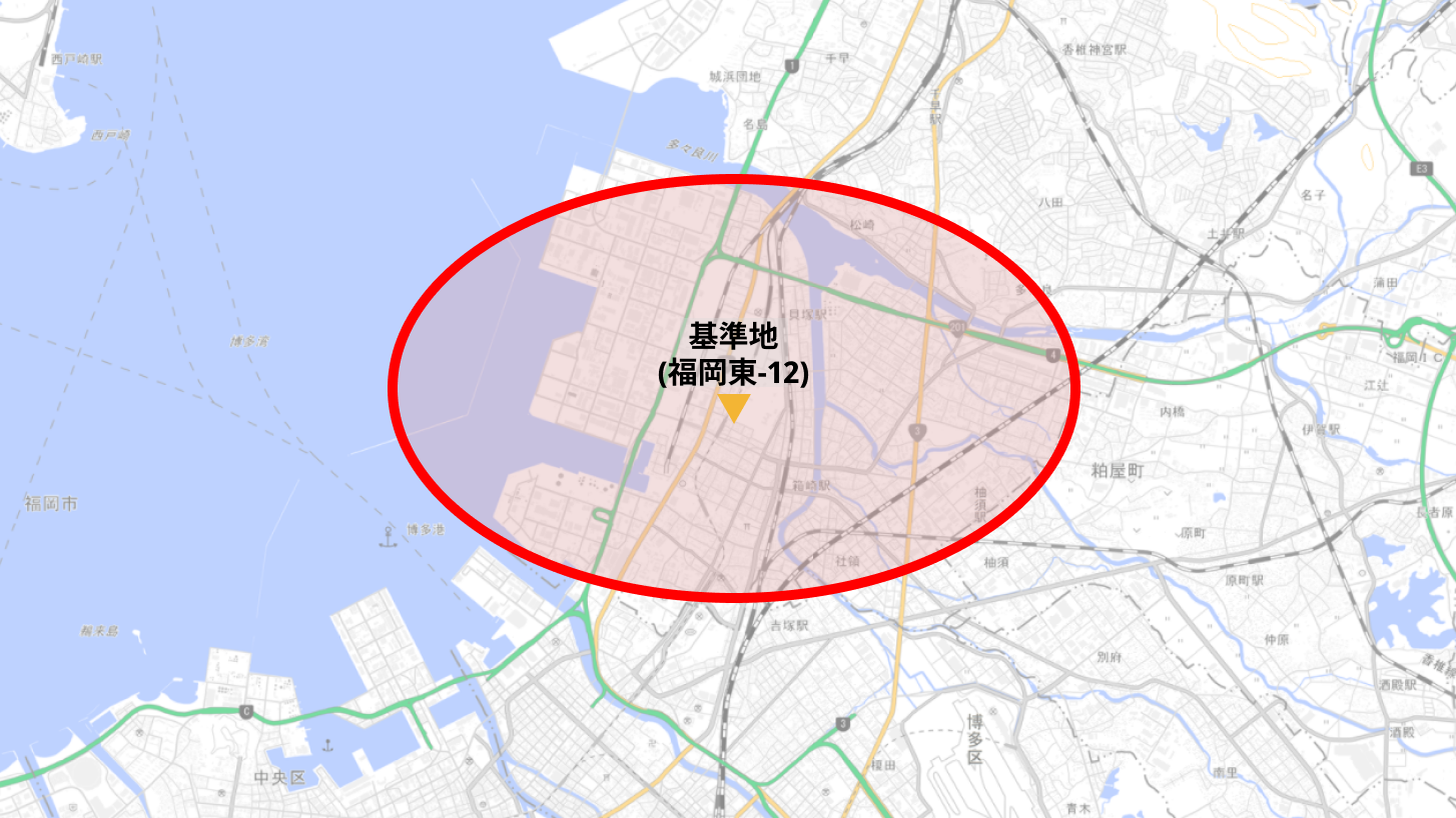 今回は、基準地(福岡東-12)周辺の下記エリア内のマンション事例①(築10年~19年)、マンション事例②(築20年~29年)、マンション事例③(築30年~45年)を対象に、過去5年の一般市場価格を抽出します。