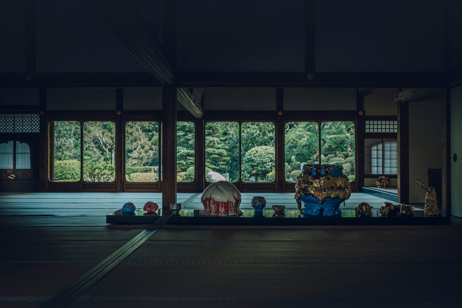 江戸時代初期に建てられた成就院の大広間には、金やプラチナ、色とりどりの釉薬と造形で表現された桑田氏の作品が並び、その奥には、国の名勝に指定される借景式庭園「月の庭」が広がって、伝統と前衛が混在する実験的なアート空間でありながらも、じっくりと作品に向き合える寺院ならではの落ち着いた雰囲気に包まれています。