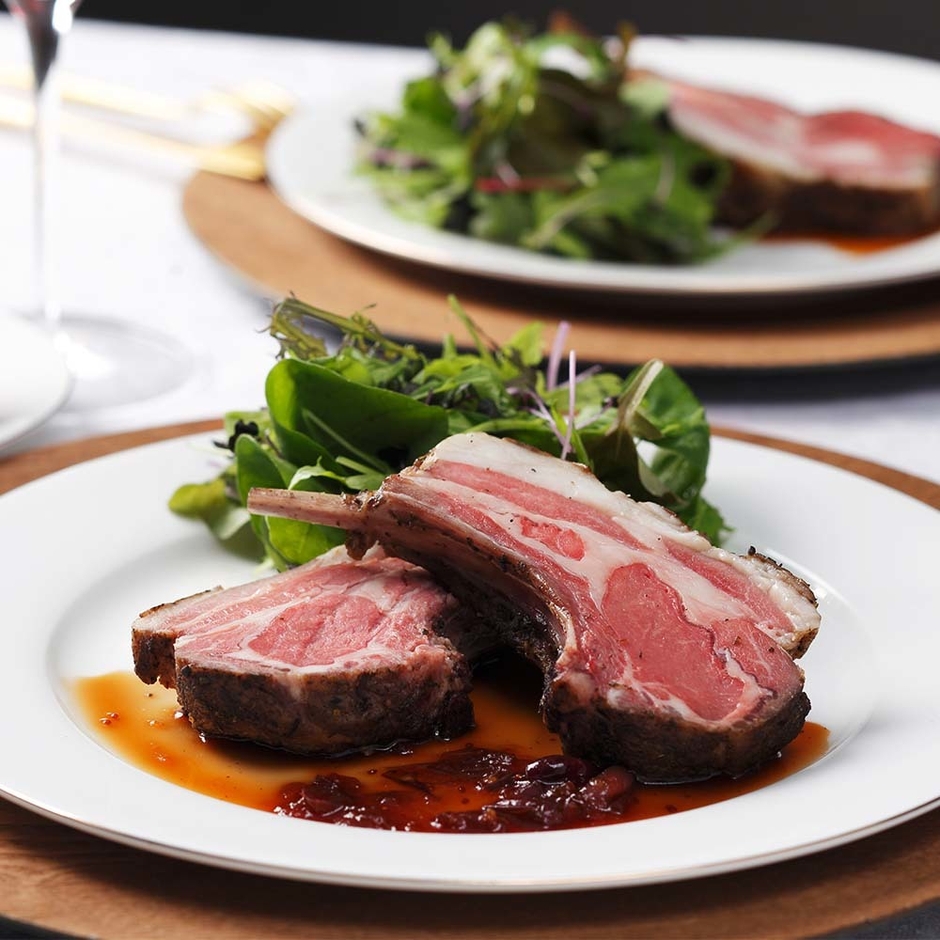 仔羊の骨付きロースのブロック肉を、余分な脂はカットして、焼き色を付け、ハーブと一緒に低温調理でじっくり焼き上げました。骨付きロースが4本ついているブロック肉を使用しています。ブロックになっているため、通常のカットだと外に漏れだしてしまう肉汁を閉じ込めてくれます。時間をかけて火を通したかたまり肉は、カットすると断面はきれいなロゼ色で、食感はやわらかくしっとりとジューシーな仕上がりです。