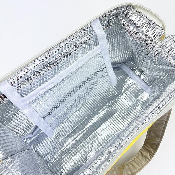 化粧ポーチみたいな見た目におしゃれで可愛いらしい印象です。内側がアルミ蒸着仕様なのでランチバッグとしてはもちろん、お買い物の際の保冷バッグとしてもおすすめです。保冷剤などを入れられるメッシュポケット付きで保冷旅行もアップできますよ。開閉しやすいWファスナー式で使いやすさも◎サイズ:16cm×22cm×11.5cm 素材:表地・持ち手:ポリエステル、裏地:アルミ蒸着フィルム
