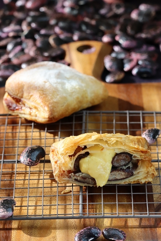 乾燥した花豆を1日水につけて戻し、下茹でした後、砂糖や水、群馬県産の醤油を少し加えたシロップで数時間煮込んでいきます。ふっくら艶やかに煮あがった花豆を64層のオリジナルパイシートで包み、パイ専門店のデッキオーブンで焼き上げます。そして焼きたての花豆パイに後入れで自家製のカスタードクリームを詰めたあと、もう一度オーブンで2次焼成をすることで、大粒の花豆とトロトロのカスタードクリーム、サクサクのパイ生地を一度に楽しめるパイが完成。