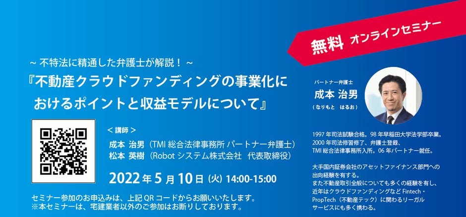 本セミナーでは、クラウドファンディングなどFintech・Proptech(不動産テック)に関わるリーガルサービスに多く携わる成本 治男弁護士に不動産クラウドファンディングの事業化のポイントと収益モデルについて解説していただきます。