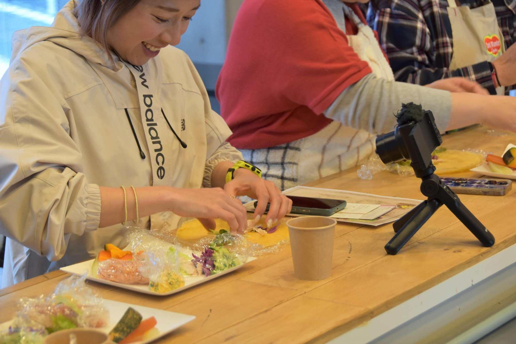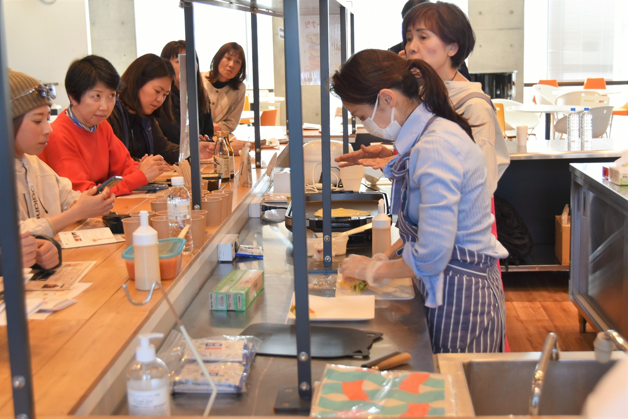 第2部では、発酵ライフ推進協会名古屋校校長で「食のアトリエ ゆいの森」主宰の古澤久美さんが発酵料理体験として、「腸活ラップサンド」などを伝授。塩麴を使った発酵鶏むね肉やトマトライス、野菜を包むトルティーヤや、塩麴や粕酢、本みりんを使ったノンオイルドレッシングで食べる温野菜、八丁味噌汁、麴甘酒が振舞われ、参加者は熱心にメモを取りながら、発酵食品をふんだんに使った料理を味わいました。