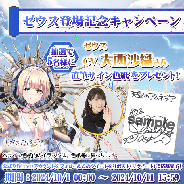 天空のアムネジア公式Xをフォロー&対象ポストをリポストされた方を対象に「ゼウス」役の声優「大西沙織」さんの直筆サイン色紙を5名様にプレゼントいたします。