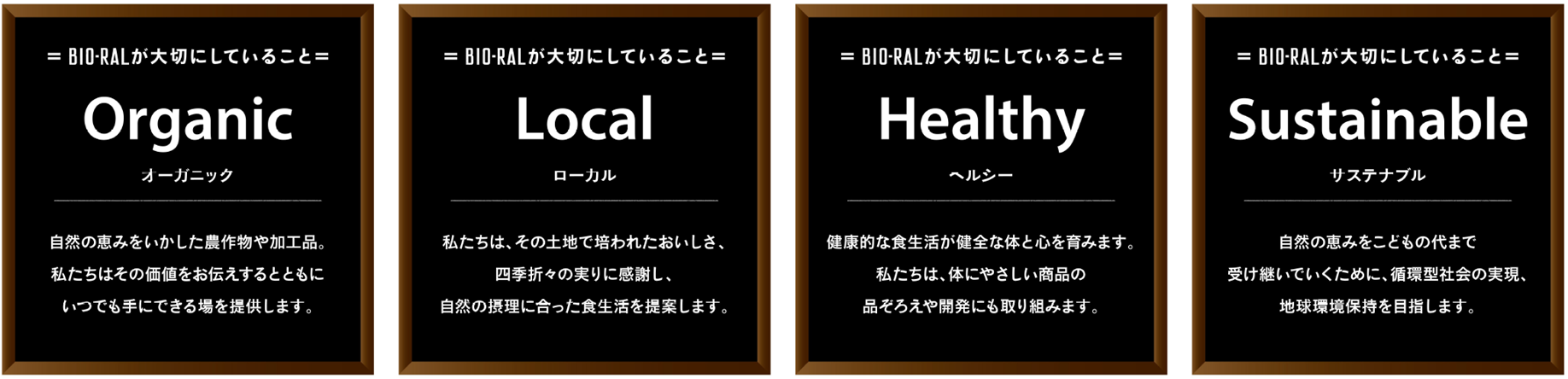 ドイツ語「BIOLOGISCH(有機の)」と英語「NATURAL(自然の)」からなる造語。“素敵なナチュラルライフスタイルを通じて、心も体も健康で美しく豊かな毎日を過ごしてもらいたい”と願うスーパーマーケット。「オーガニック・ローカル・ヘルシー・サステナブル」をコンセプトに、ナチュラルライフスタイルをご提案し、お客様の心と体の健康と豊かな日々をお手伝いできるよう魅力ある商品を提供しています。