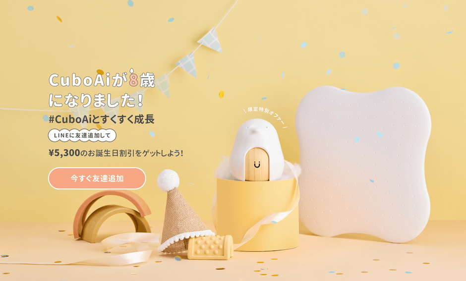雲云テクノロジー株式会社(本社:東京都千代田区、代表:TSENG, CHIH HSIN 曾志新(ゼン・ヅーシン))は、ブランド誕生8周年を記念して、2025年2月14日(金)0:00から2月27日(木)23:59までCuboAi公式サイトにて、『CuboAi スマートベビーモニター(第3世代)』、『CuboAi 赤ちゃんねんね見守りセット(第3世代)』の割引キャンペーンを開催いたします。公式サイトからLINEお友達追加で得たクーポンをキャンペーン期間中に使用すると5,300円オフとなります。