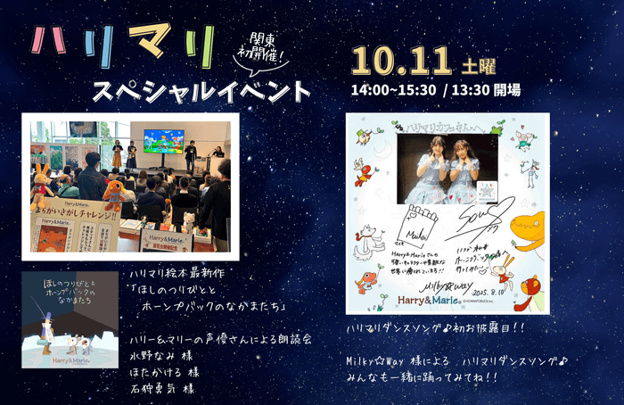 宝塚市で好評を博した、ハリー&マリーの声優さんによるスペシャルイベントが関東に初披露!絵本最新作『ほしのつりびととホーンプバックのなかまたち』の朗読会や、子どもたちが声優体験できる楽しい企画、さらにはクイズ大会、じゃんけん大会など、参加型のイベントで会場を盛り上げます。