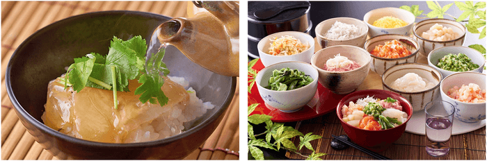 左:特製だれに漬け込んだ弾力のある鯛を熱々のご飯に乗せて。そのままでももちろん、薬味を添えて出汁を注いで茶漬けスタイルで楽しむ、1膳で2度美味しい人気メニューです。