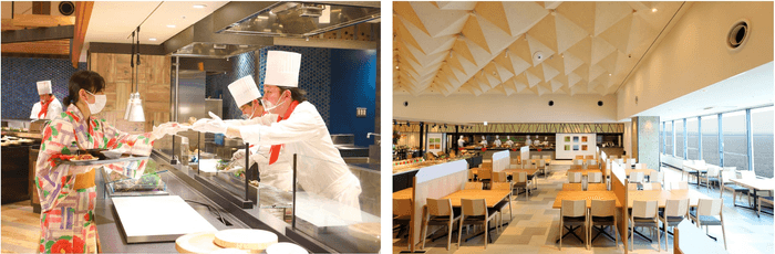 左:朝も夜もフル稼働のライブキッチン。夕食のステーキや天ぷらはもちろん、朝食には大分名物とり天や日田焼きそば、九州ご当地麺食べ比べもご提供する活気溢れるコーナーです。美味しいだけでなく、お客様に笑顔でお声掛けするスタッフも美味しさのスパイスです。