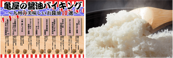 左:【10種類の九州産醤油】。お造りコーナーには、約10種類の九州産の醤油をご用意。九州地方特有の甘露醤油だけでなく、風味豊かなだし入り、珍しいところでは透明の醤油もご用意いたしました。また、当宿開業記念に製造された「亀屋オリジナル くまもん甘露醤油」は小さなお子様に人気です。豊富な種類のお造りと合わせて、個性溢れる日本古来の調味料の美味しさをお楽しみください。