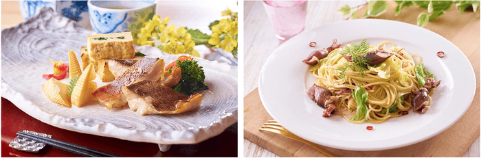 右:旬を迎えたやわらかな食感の春キャベツとホタルイカを使ったオイルベースのシンプルなパスタ。程よい塩味、福井名物のへしこが春食材の旨味を引き立てます。