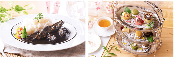 右:「春のスイーツ25種」。別腹のお楽しみスイーツは、どれを食べようか本気で迷ってほしい!という気持ちを込めて和洋25種類のスイーツをご用意しました。種類の多さだけでなく、華やかな見た目やディスプレイにも心が浮き立ちます。
