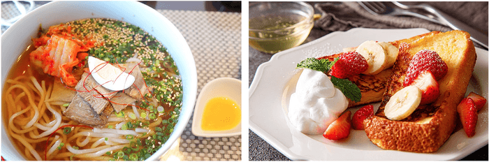右:この春の朝食メニューのイチオシ、【フルーツフレンチトースト】。しっかりと卵液を染み込ませて鉄板で焼いたフレンチトーストにふんわりホイップとフレッシュいちごを添えた魅惑的なビジュアルの一品。もちろん味もお墨付きです。