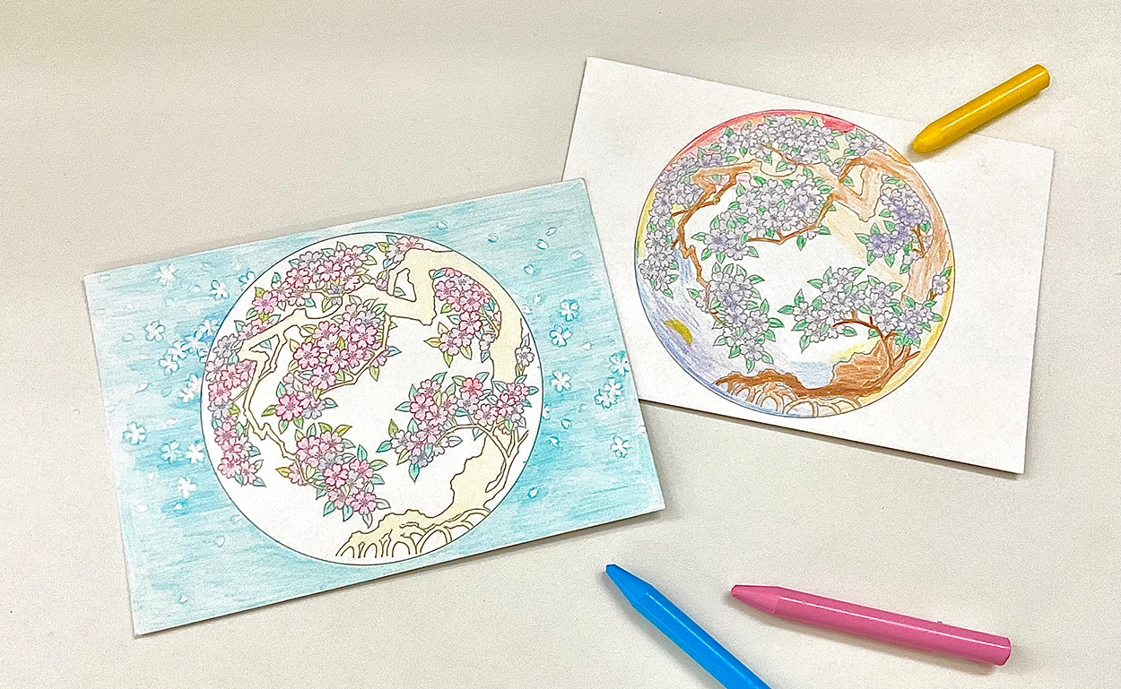 「博物館でお花見を」にあわせ、当館所蔵《色絵桜樹図皿》のぬりえをお楽しみいただけます。