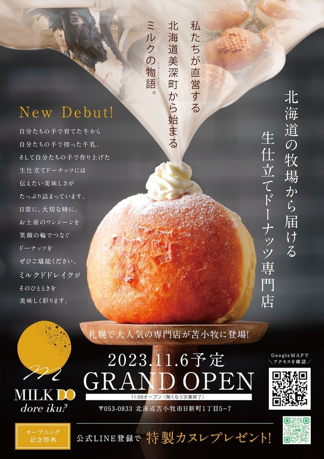 札幌で連日大行列の生仕立てドーナツ専門店 『MILK DO dore iku?』が11月6日(月)苫小牧にオープン!