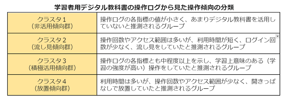 本研究では、家庭学習時における学習者用デジタル教科書(中学校英語)の操作ログから、各生徒が学習に意味のある操作をどれくらいしていたか(学習の強度)を推測するために、学習上無関係と推測されるログを除外した上で主成分分析を行い、その結果に基づき、生徒の操作傾向を下記の4つのクラスタに分類しました。