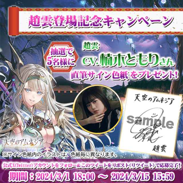天空のアムネジア公式X(Twitter)をフォロー&対象ポストをリポストされた方を対象に「趙雲」役の声優「楠木ともり」さんの直筆サイン色紙を5名様にプレゼントいたします。