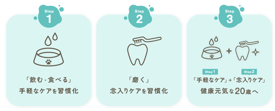デンタルケア=歯磨き、そう思っている飼い主様が多くいらっしゃいますが、わんこのデンタルケアを続けることは簡単ではありません。そのためハノケアでは、まずは続けやすい、飲み水に混ぜて飲むだけ、ごはんにかけて食べるだけの手軽なケアを習慣化することを推奨しています。飼い主様もわんこもストレスなくデンタルケアを続けることができ、自信をつけてもらうことが重要です。歯磨きは次のステップとして焦らず取り組み、組み合わせて習慣化することで、健康元気な20歳を目指してほしいと願っています。