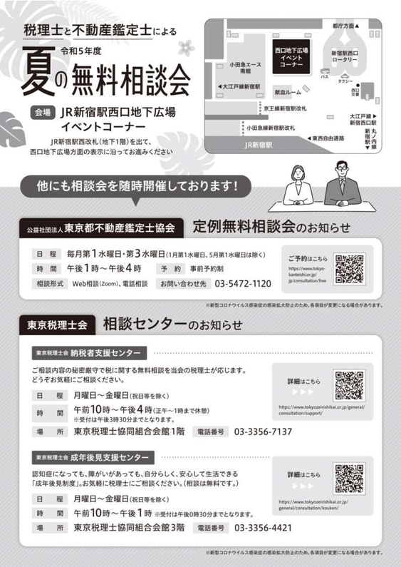 令和5年度 税理士と不動産鑑定士による“夏の無料相談会”を 新宿駅西口広場イベントコーナーにて7月14日(金)10時から開催