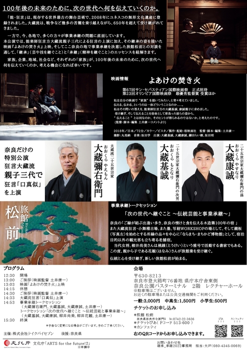 本公演では、能楽師狂言方大藏流親子三代による狂言の上演に加え、その継承の姿を描いた 映画『よあけの焚き火』上映、そしてここ奈良の地で事業承継を決意した旅館松前との対談を 通して、「継承」(芸や技を継ぐこと)と「承継」(精神を継ぐこと)のエッセンスを紐解きます。