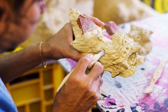 シーサーが誕生するまでの工程を間近で見学します。表情豊かなシーサーが、生み出されている工房で、制作過程をじっくりと見学。土を伸ばしながら成形する「手びねり」や、型にはめて成型する「型もの」などの手法があり、柄や色を含め、姿が生み出されていく様を見ることで、充実した時間を過ごすことができます。豊富な種類のシーサーから、自分好みのシーサーを見つけて、お買い物を楽しむこともできます。