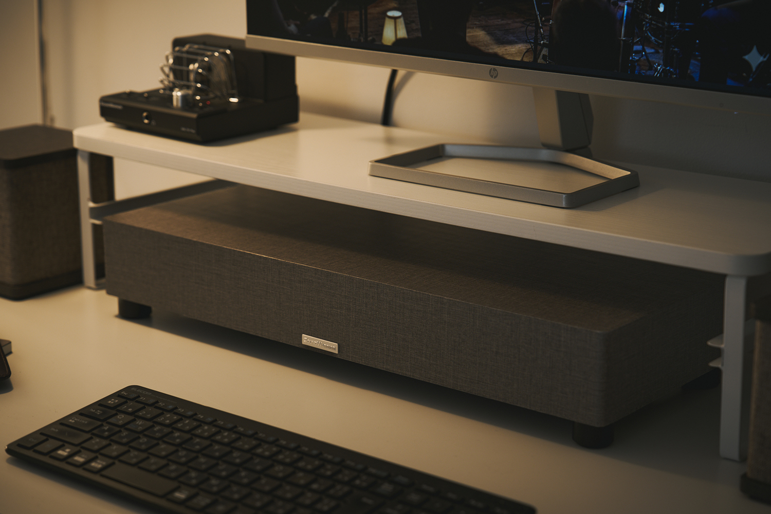従来のサブウーファーはそのサイズや重量から、床に置くのが常識でした。しかし、それでは足元が塞がり、スピーカーとの距離が離れることで音のバランスが崩れやすくなります。「SW-W1」は、デスク上のデッドスペースであるモニターの下に収まる、超コンパクト設計を実現。スピーカーとサブウーファーがデスク上に並ぶことで、低音から高音までがひとつの塊となって耳に届きます。この“位相の良さ”が、まるで目の前にアーティストが立っているかのような圧倒的な立体感を生み出すのです。