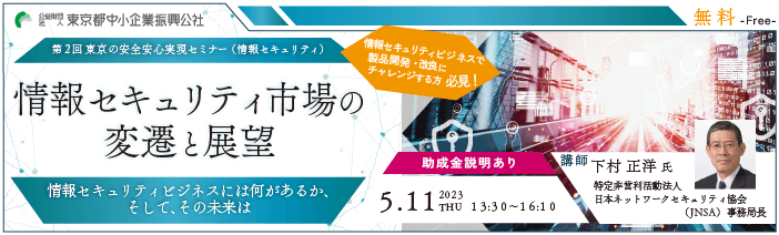 東京都では令和5年度より「安全・安心」をテーマとした製品や技術の開発・改良のための助成金を新たにスタートしました。公益財団法人東京都中小企業振興公社では、助成金の普及啓発として、対象分野の一つ「情報セキュリティ」をテーマとした「情報セキュリティ市場の変遷と展望 ~情報セキュリティビジネスには何があるか、そして、その未来は~」を2023年5月11日(木)秋葉原会場およびZoomで開催いたします。本セミナーでは、情報セキュリティ市場の変遷をたどりながら、今後見込まれる情報セキュリティビジネスについてわかりやすく解説すると共に、助成金の概要についても説明します。