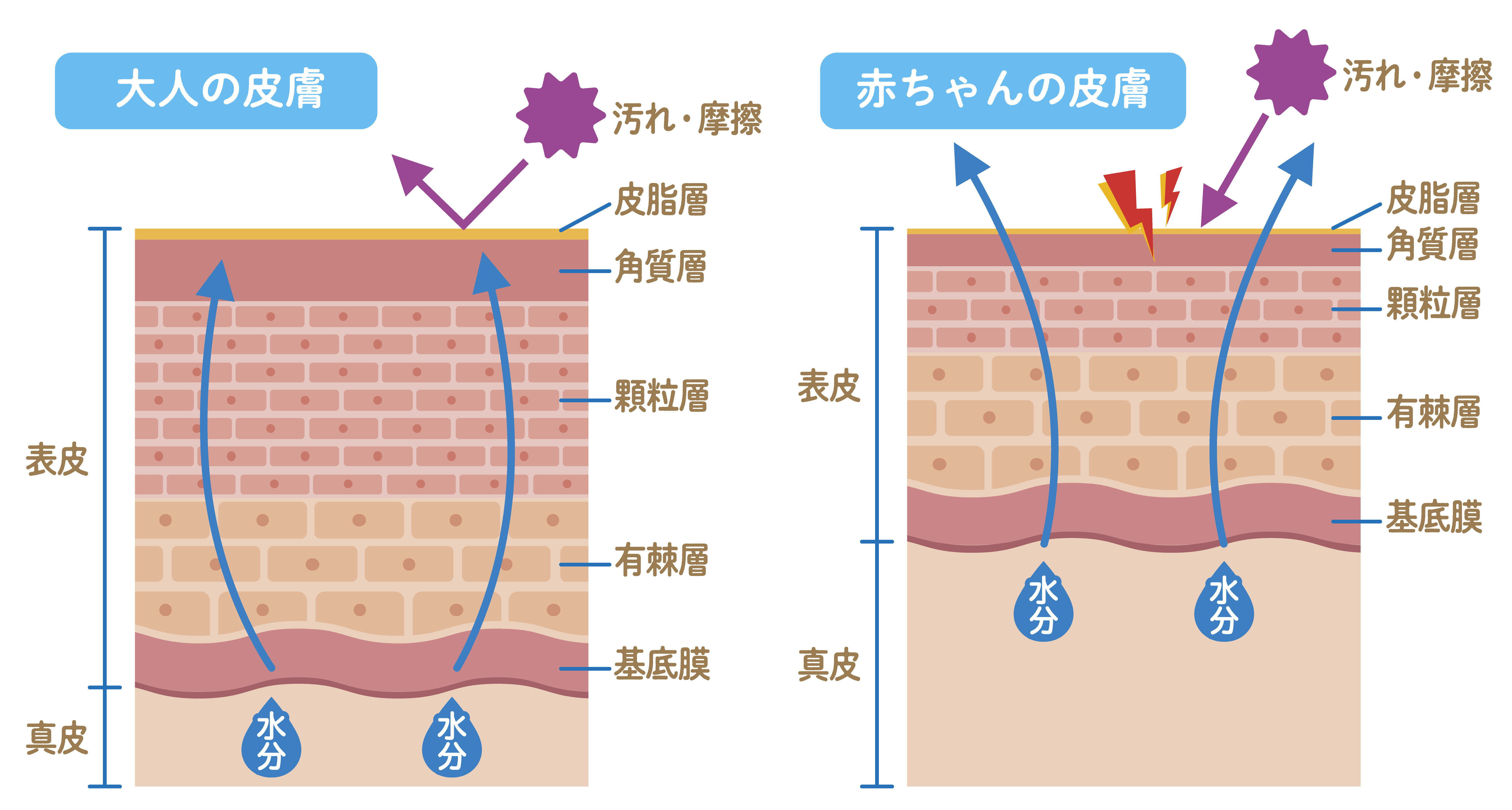 おむつかぶれの主な原因としては、(1)ムレ・(2)摩擦・(3)刺激の3つが挙げられます。大人の約半分の薄さしかない赤ちゃんの肌はバリア機能が未発達です。特におむつ内などの「ムレ」た皮膚はふやけて傷つきやすく、拭き取り時の「摩擦」や汚れ残りによる「刺激」が、皮膚トラブルの原因になってしまいます。また、口周りにおいても、よだれや食べ残しの付着が刺激となり、皮膚トラブルに繋がるリスクがあると考えられています。
