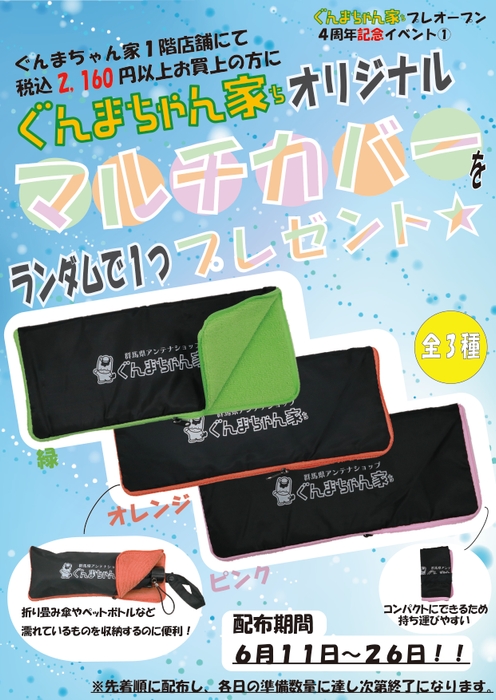ぐんまちゃん家1階店舗にて、税込2,160円以上商品をお買い上げの方に、ぐんまちゃん家オリジナルの「マルチカバー」を1個プレゼント!