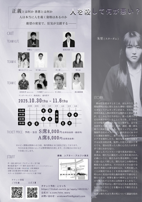 2025年10月30日(木)~11月6日(木)、東京・シアター・アルファ東京にて、舞台『人を殺して何が悪い?』の上演が決定しました。