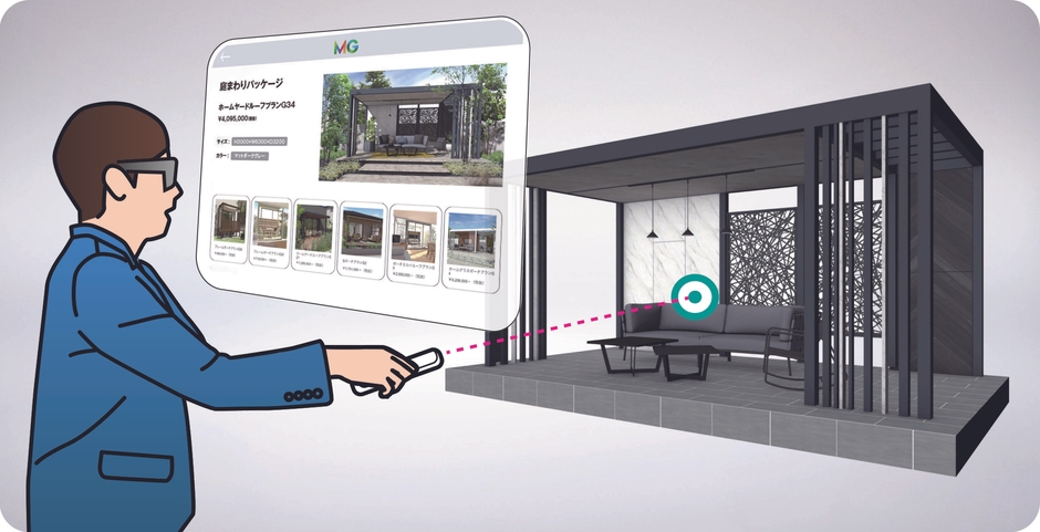 『メタバガーデン for MRグラス』を活用することで、自社ショールームや展示スペースがなくてもスマートグラスを通じてバーチャル化された当社のさまざまなガーデン・エクステリア商品を配置し、施工後の完成イメージをMR(Mixed Reality:複合現実)でシミュレーションすることが可能です。