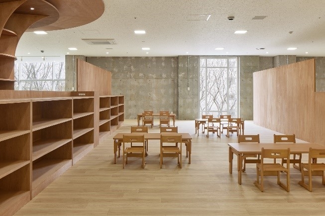 キャンパス内には、自然豊かな周辺環境をイメージさせるシンボリックな「ライブラリーツリー」や、日が差し込む「ステージエリア」があります。また、「マルチパーパスエリア」では、体育やダンス等のプログラムを安全に行うため、クッション性と衛生面に優れた床材を使用しています。キャンパスはワンフロアの開放的なつくりですが、可動式の間仕切りを導入し、活動内容と生徒数に応じたスペースづくりが可能であり、あらゆる探究活動に柔軟に対応できる空間となっています。