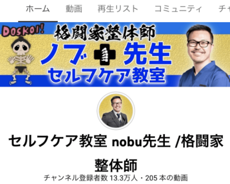 「セルフケア教室nobu先生/格闘家整体師」 2022年1月にYouTubeチャンネル登録者数13万人を達成し、 TikTokでも「コロナワクチン注射痛み解消」が300万再生を突破