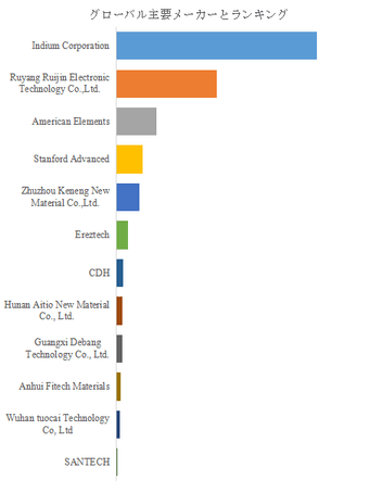 LP Informationのトップ企業研究センターによると、酸化インジウムの世界的な主要製造業者には、Indium Corporation、Ruyang Ruijin Electronic Technology Co.,Ltd.、American Elements、Stanford Advanced、Zhuzhou Keneng New Material Co.,Ltd.、Ereztech、CDH、Hunan Aitio New Material Co., Ltd.、Guangxi Debang Technology Co., Ltd.、Anhui Fitech Materialsなどが含まれている。2024年、世界のトップ5企業は売上の観点から約78.0%の市場シェアを持っていた。