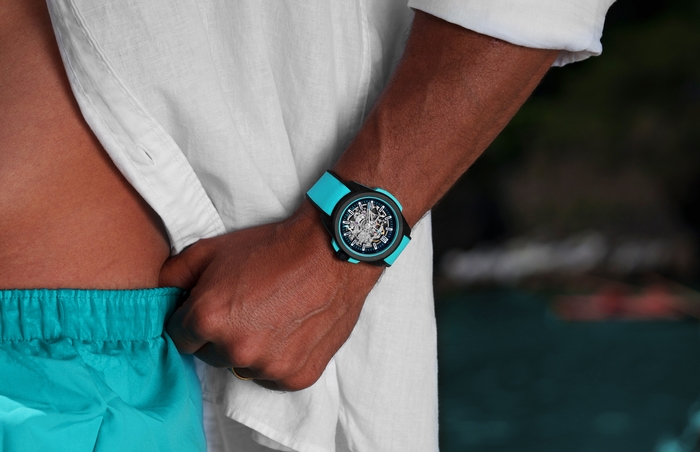 「Wild ONE Skeleton」ターコイズモデルは、ラバー製ショックアブソーバーとストラップに鮮やかなターコイズブルーを採用したビーチスタイルのWild ONEです。地中海のビーチクラブでのゆったりとした1日の雰囲気を演出し、ひときわ目を引く存在感を放ちます。日光浴、水泳、サーフィンなど、さまざまな場面に揺るぎない評価を得ている究極の高性能スポーツウォッチです。