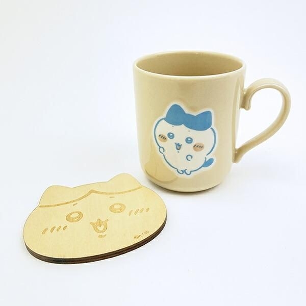 ベージュでやさしい色合いのハチワレマグカップは、やさしくて思いやりのあるハチワレにぴったり!なんだかハチワレに応援されているみたいな気持ちになります。木製コースター付きなのがうれしい!