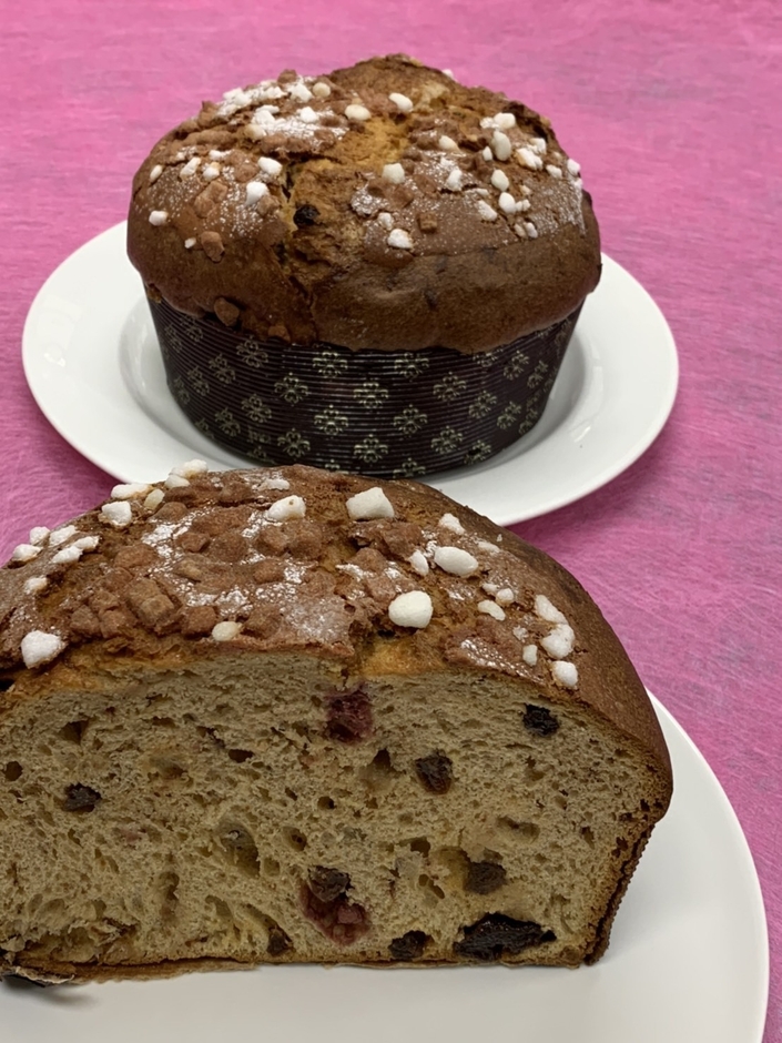 パネトーネの製造は、パネトーネ菌と呼ばれる天然酵母を使い、発酵させて作っています。天然酵母を使用しているので、特有の製造の難しさもあります。生地の発酵の過程で酸性になることで雑菌が死滅するので、1か月から2か月ほど日持ちがする変わった食品です。保存に優れていて、イタリアではパネトーネを1週間から2週間ほどかけて、家庭で食べるそうです。切ったり、ちぎったりして、小分けにして食べるのでご家庭で長く楽しめます。