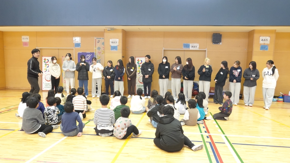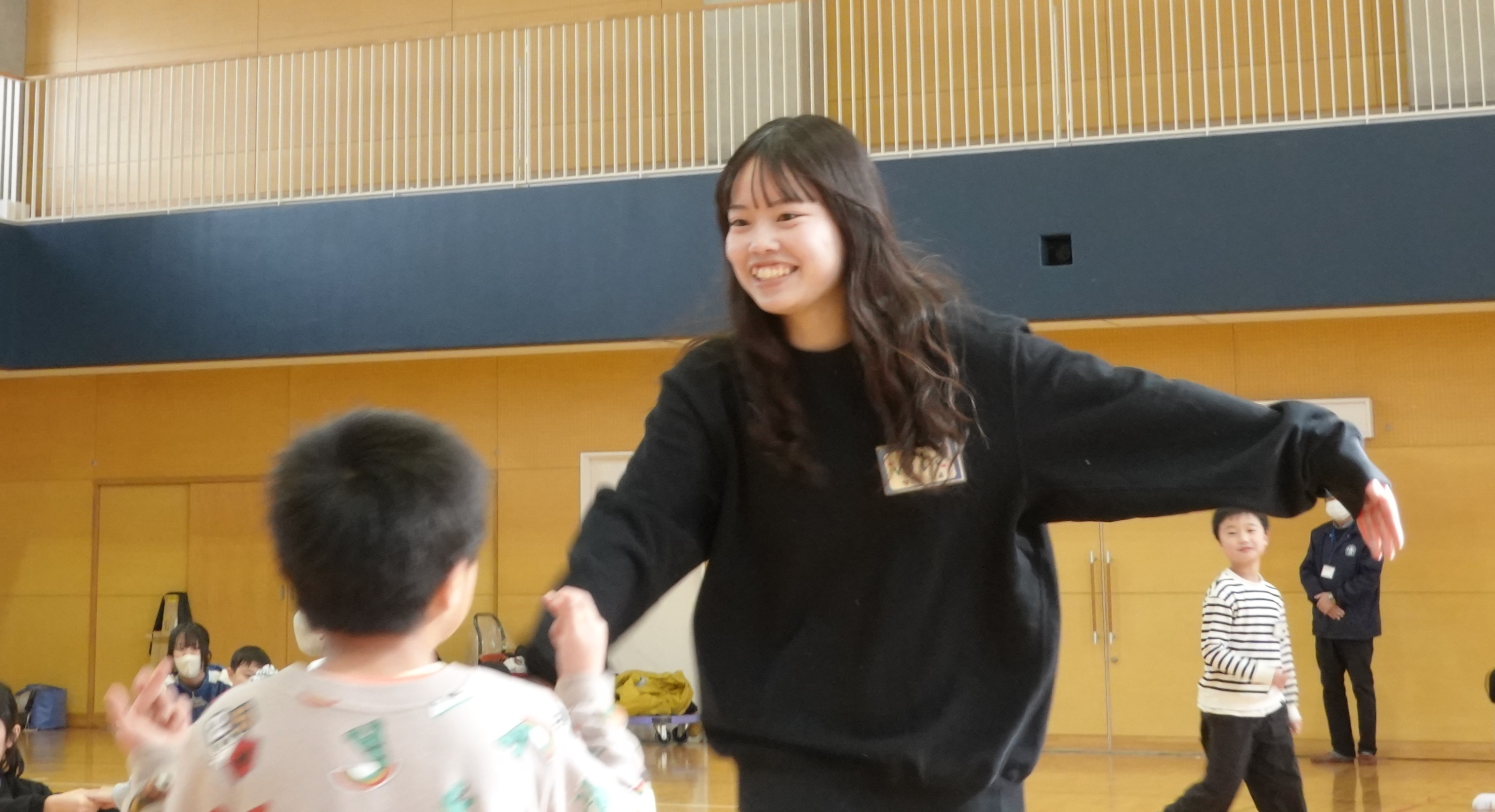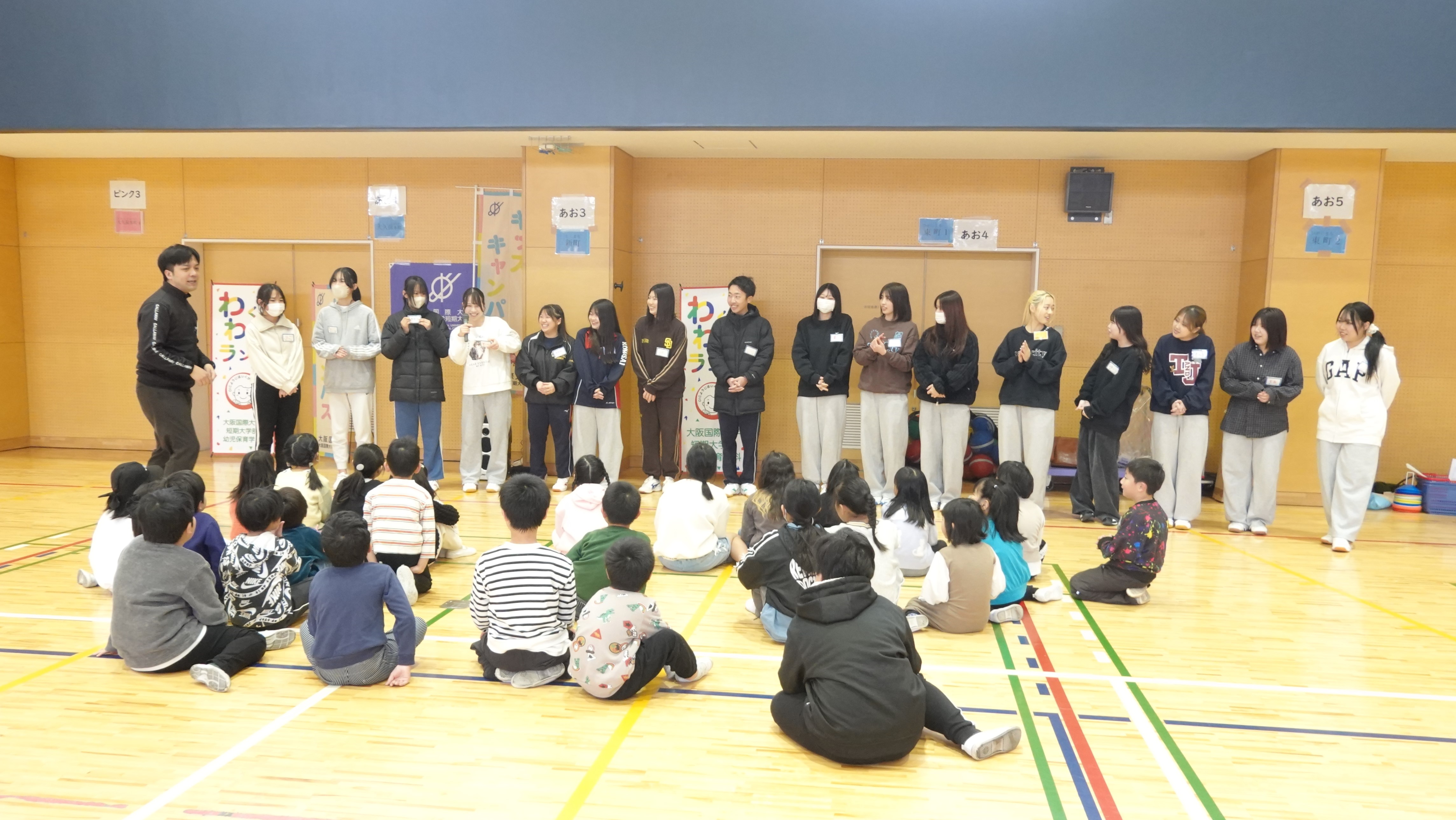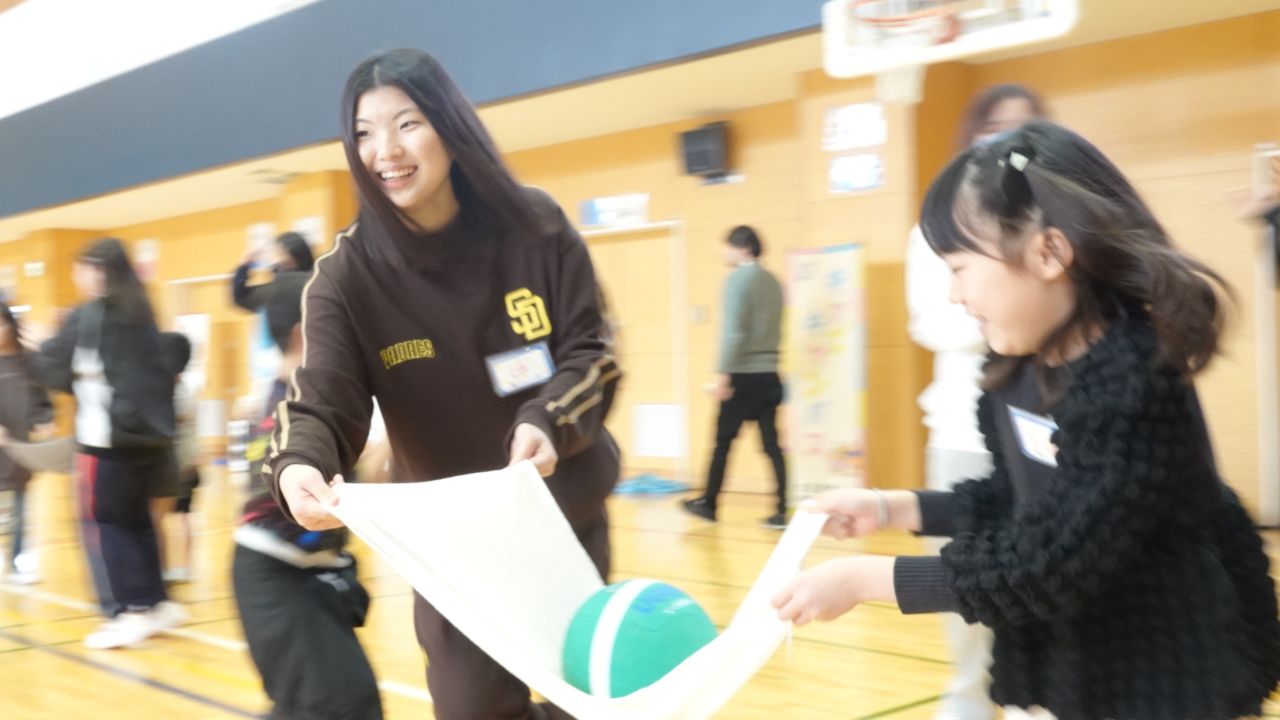 参加した小学生は、低学年の多い中で、高学年も夢中で遊べるようなプログラムを考えました。準備体操では、みんなが楽しめるように音楽をかけて曲に合わせた体操を考え、遊びでは、初めは少し緊張することを想定し、2人1組で楽しめるものから始め、徐々に人数を増やして全員が楽しめるようにしました。